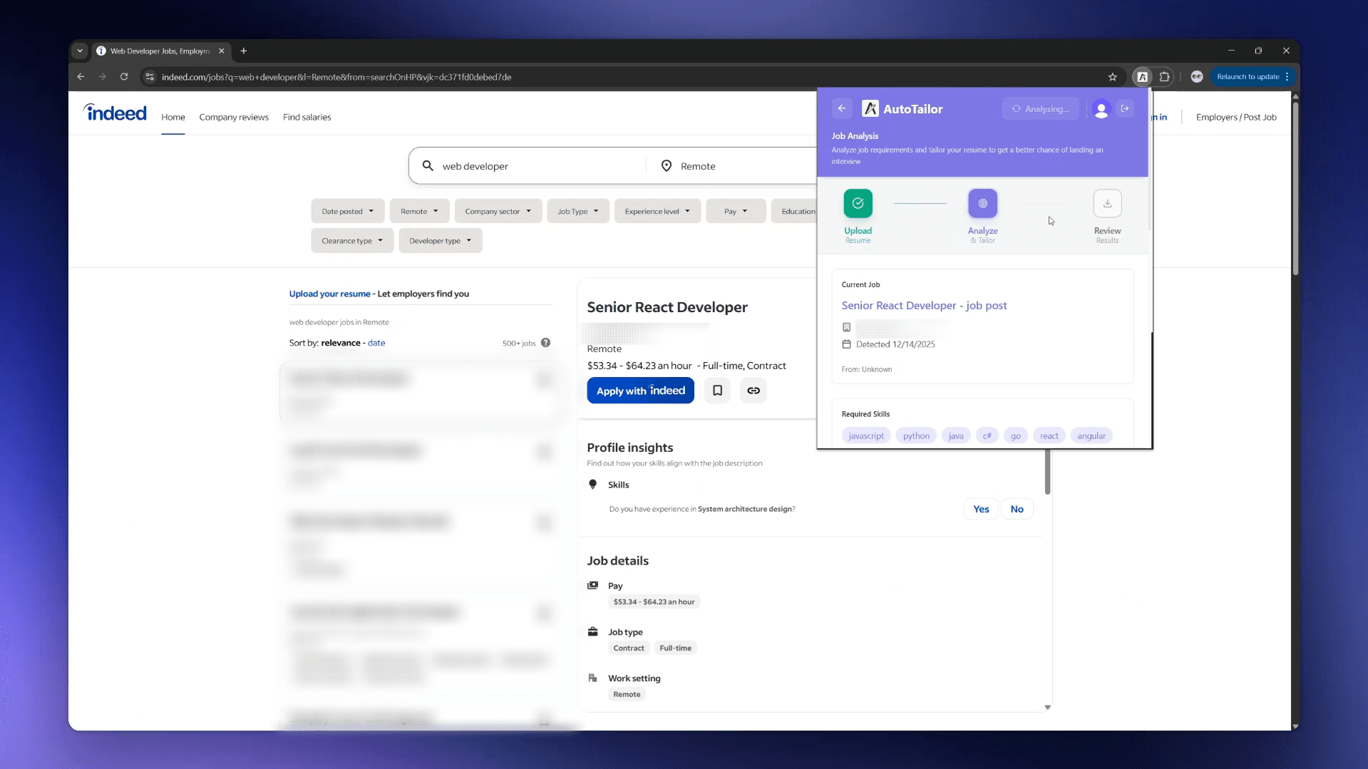 Click 'Analyze Job' on any job posting to automatically extract requirements and qualifications.